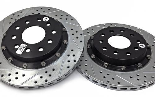 Drilled And Slotted; Two Piece Design; 14 Inch Diameter; Zinc Chromate; With Hat Assemblies/ Caliper Relocation Brackets And Hardware; Set Of 2