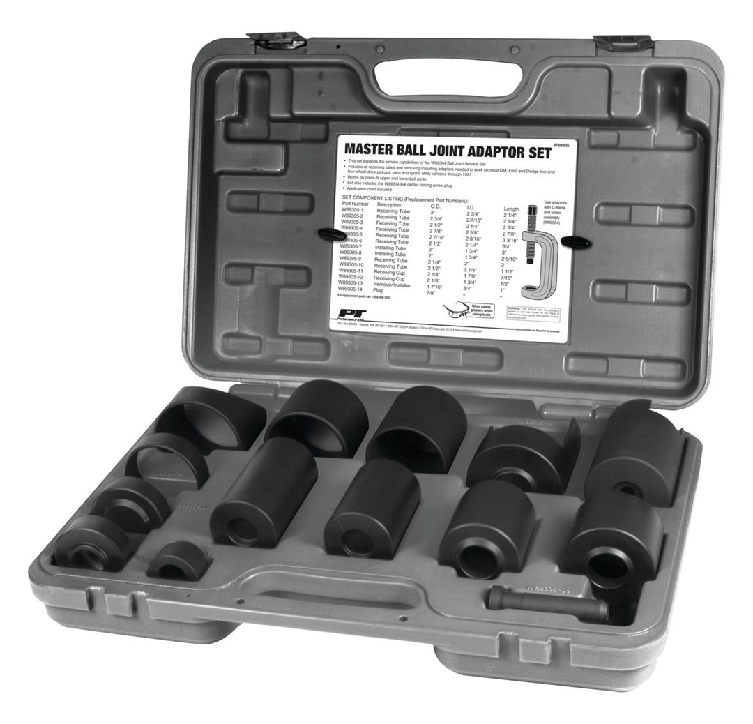 Works With Performance Tool Number W89304 Ball Joint Service Set; With Receiving Tubes/ Installing Adapters/ Center Forcing Screw Plug/ Carrying Case; Work On Most GM/ Ford/ Dodge Two And Four Wheel Drive Pickups/ Vans/ SUVs