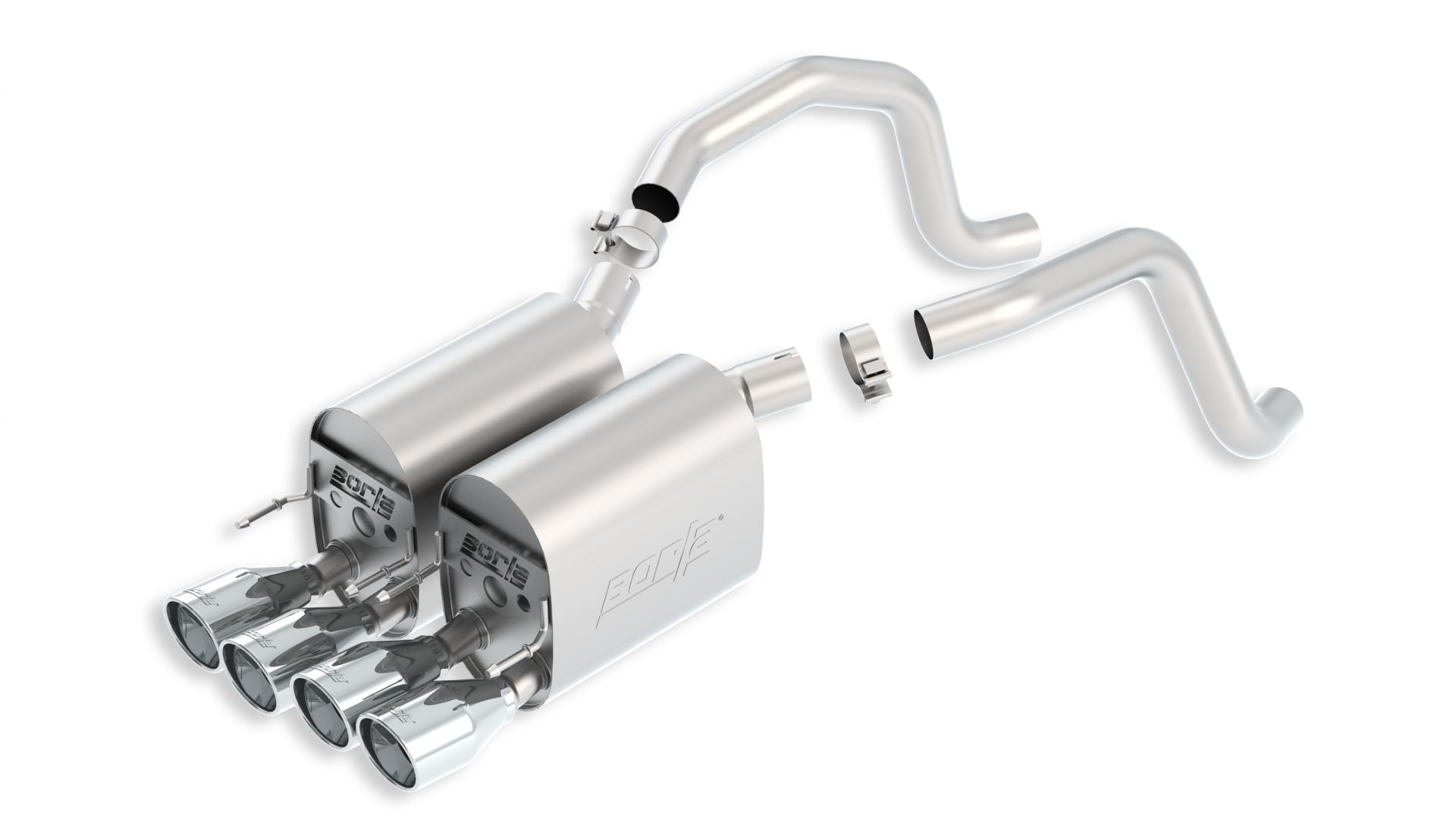 S-Type II Axle Back System T-304 Stainless Steel; With Mufflers; 2-1/2 Inch To 2 Inch Pipe Diameter; Dual Exhaust With Quad Exit; Center Rear Exit; 4 Inch Diameter x 7 Inch Length Round Polished T-304 Stainless Steel Tip