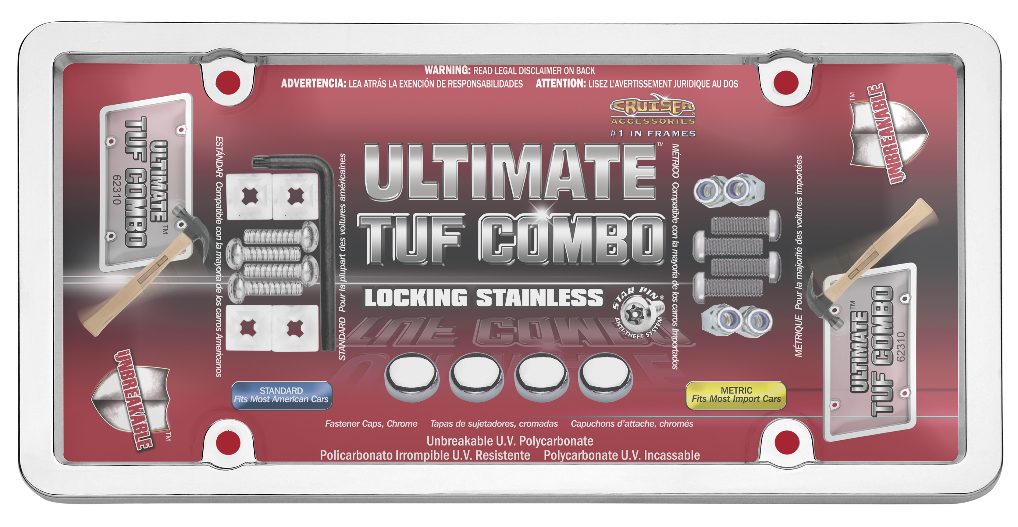 Ultimate Tuf Combo - Without Design; Chrome; Die Cast Zinc; With Clear Tuf Shield/ Anti-Theft Locking Fasteners And Chrome Fastener Caps