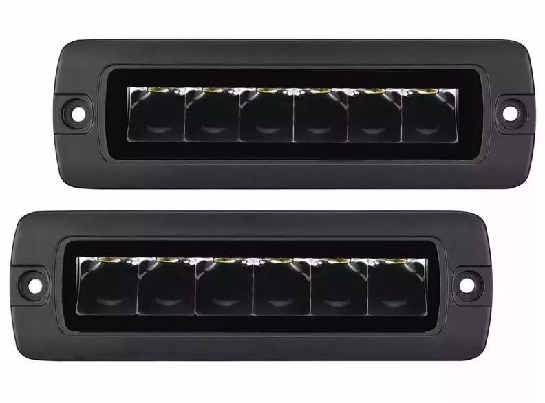 LED Bulb; 6 OSRAM 5 Watts; 6 x 2 Inch Rectangle; 30 Watts At 2.04/12 Volt - 1.04/24 Volt; Spot Beam; 2,880 Raw Lumen; Clear Polycarbonate Lens; Black Aluminum Housing; Surface Mount; With Light/ Relay/ Switch/ Wire Harness