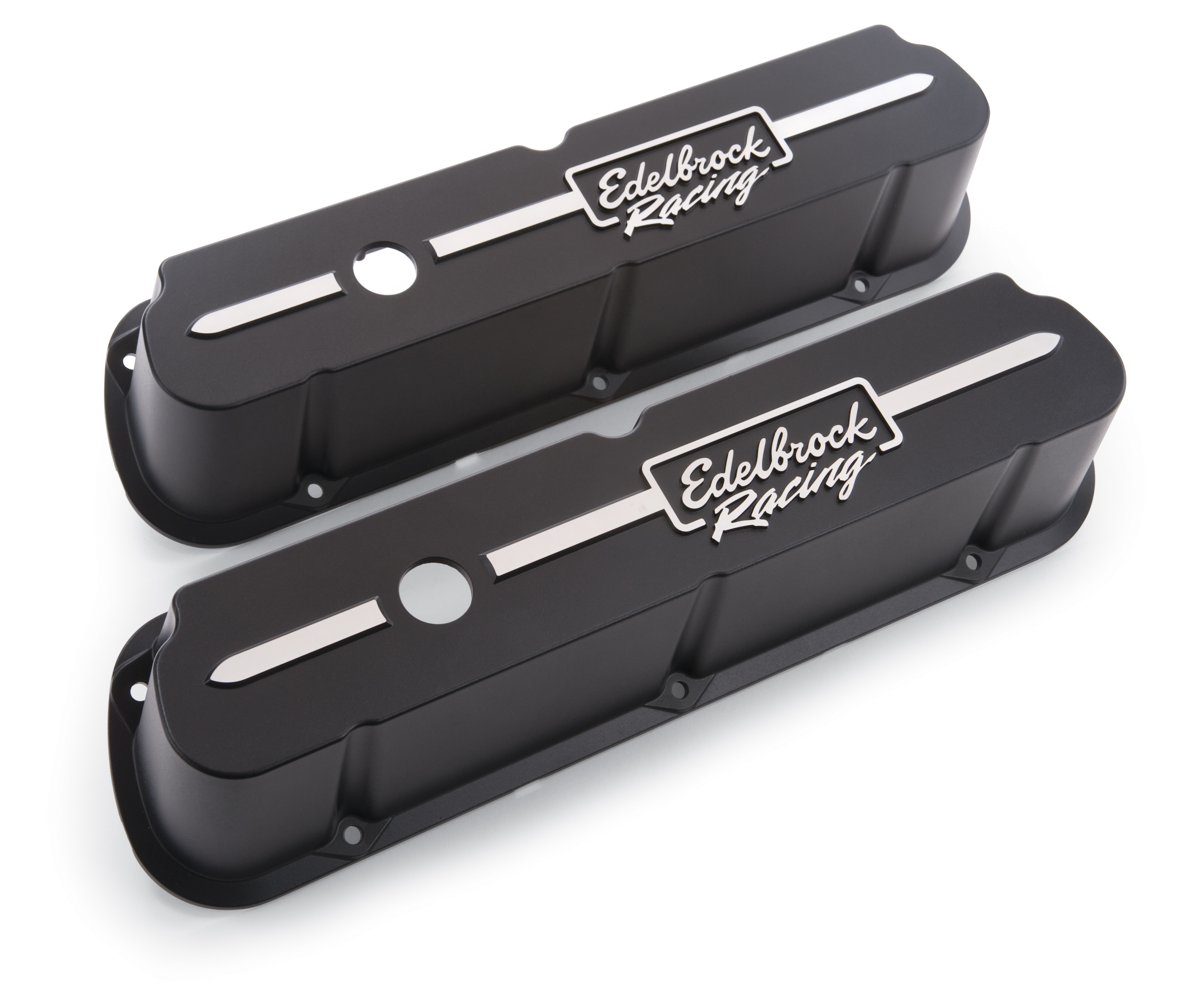 Ford Windsor Small Block 3.6L-5.8L/221-351 Cubic Inch; 3.70 Inch Tall; Perimeter Bolt; With Oil Fill Hole; With Breather Hole; Without Baffles; Edelbrock Racing Logo; Powder Coated; Black; Aluminum; Set of 2