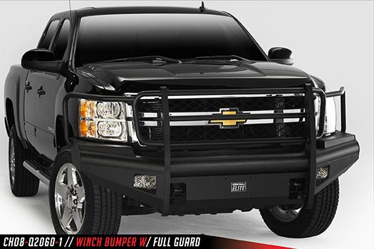Black Steel Elite - One Piece Design; Direct Fit; Mounting Hardware Included; With Grille Guard; Without Winch Mount; With Tow Hooks; With OE Fog Light Cutouts; Powder Coated Black Steel