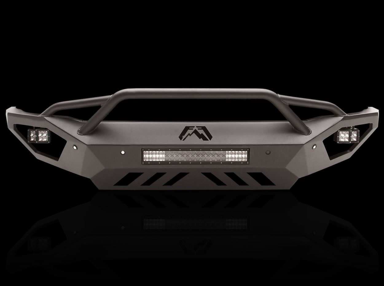 One Piece Design; Direct Fit; Mounting Hardware Included; Without Grille Guard; Without Winch Mount; Without Tow Hooks; With Mounts For Rigid 20 Inch Light Bar/ Two 3 Inch Square Dually Lights; Powder Coated Black Steel; With Airflow Cutout