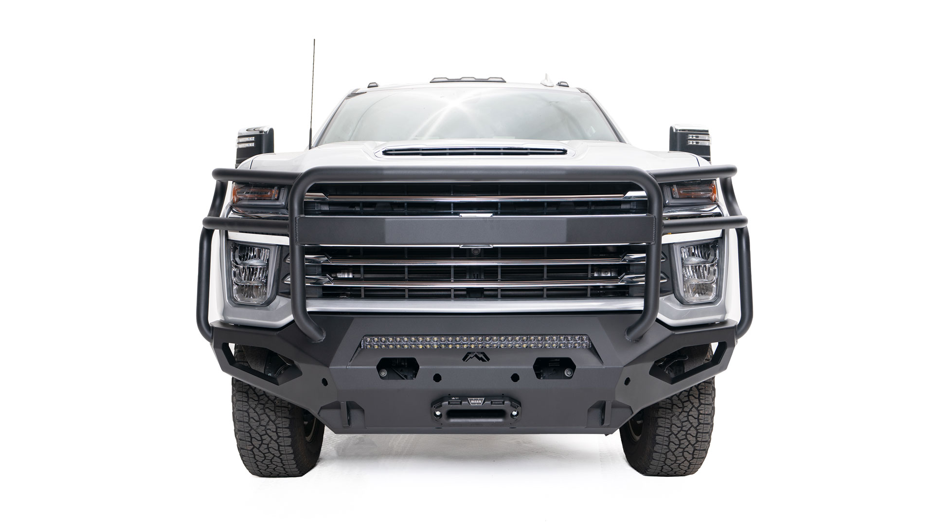One Piece Design; Direct Fit; Mounting Hardware Included; Without Grille Guard; Without Winch Mount; Without Tow Hooks; With Mounts For Rigid 20 Inch Light Bar/ Two 3 Inch Square Dually Lights; Powder Coated Black Steel; With Airflow Cutout