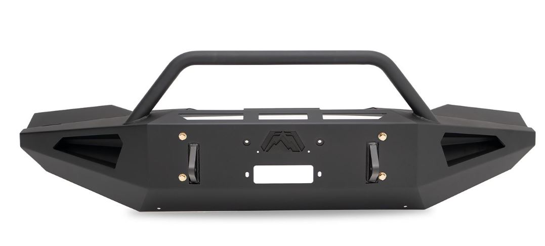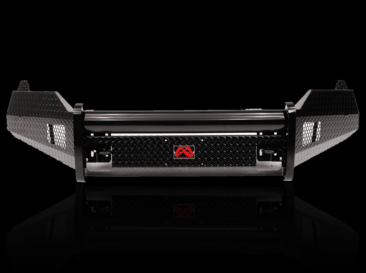 Black Steel - One Piece Design; Direct Fit; Mounting Hardware Included; With Grille Guard; Without Winch Mount; With Tow Hooks; With OE Fog Light Cutouts/ Will Accept 3X3 Cube Light With Slight Bracket Modification; Powder Coated Gloss Blac