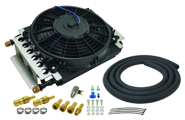 For Engine Oil/ Transmission Fluid/ Power Steering Fluid/ Fuel; 15-3/4 Inch Width X 11-1/2 Inch Height X 5 Inch Depth; 16 Passes; AN Fitting; -8 AN Inlet; -8 AN Outlet; With 650 Cubic Feet Per Minute Reversible Electric Fan/ Cooler Assembly/ 180 Degree Fahrenheit In-Line Thermostat/ Four AN To Hose Barb Adapter Connection/ 10 Feet OEM Hose/ Four Stainless Steel Clamps/ Electrical Connectors And 1/4 Inch Mounting Hardware/ Two 1/2 Inch X 1/2 Inch Hose Barb Compression Fittings