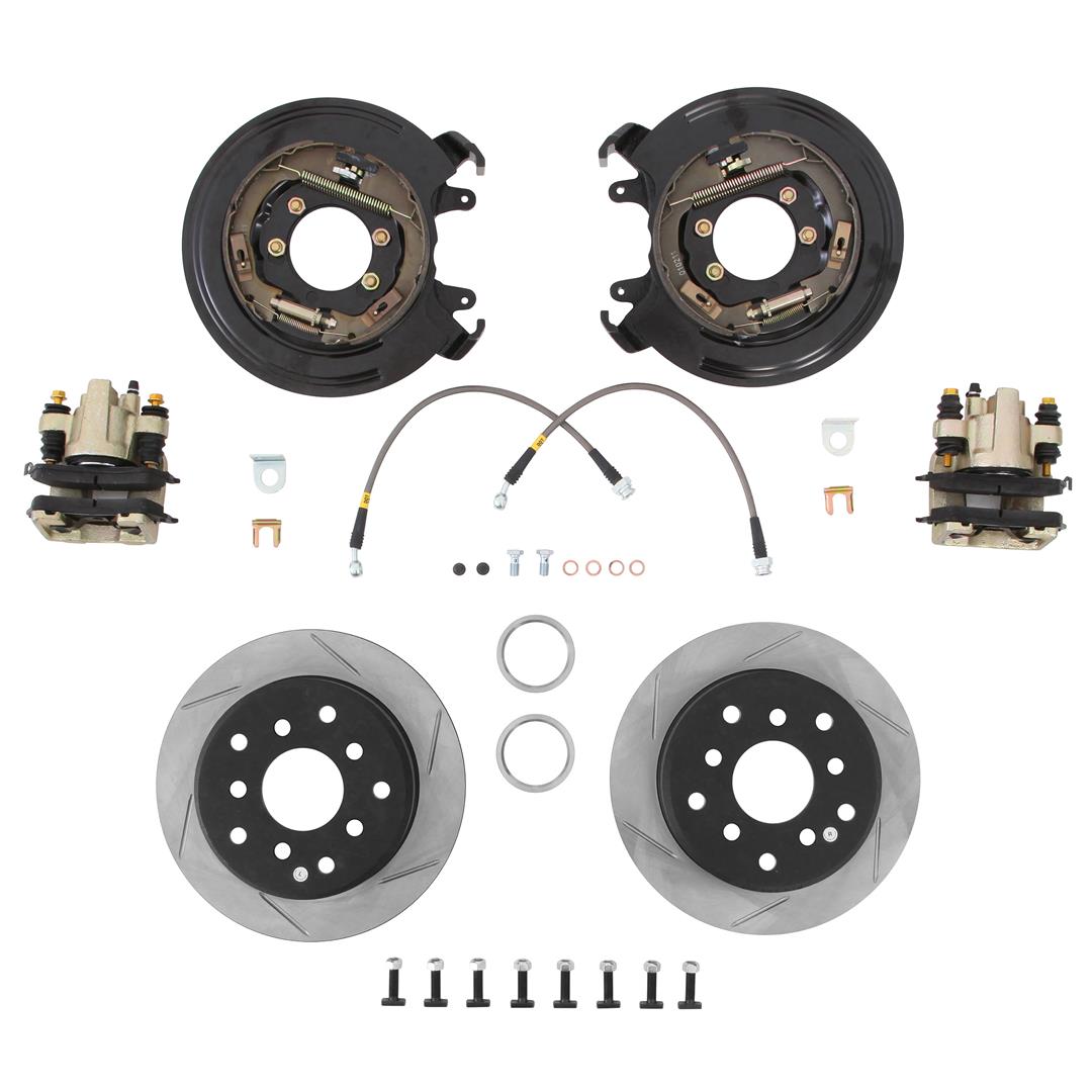 Disc Brake Conversion - Drum To Disc Conversion Kit; For Chrysler 8.25/ DANA 35/ DANA 44 Axles; Slotted Rotors With 5 x 4.5 Inch/ 5 x 5.5 Inch Bolt Pattern; Single Piston Natural Caliper; With Rotors/ Pads/ Calipers/ Internal Drum Parking B