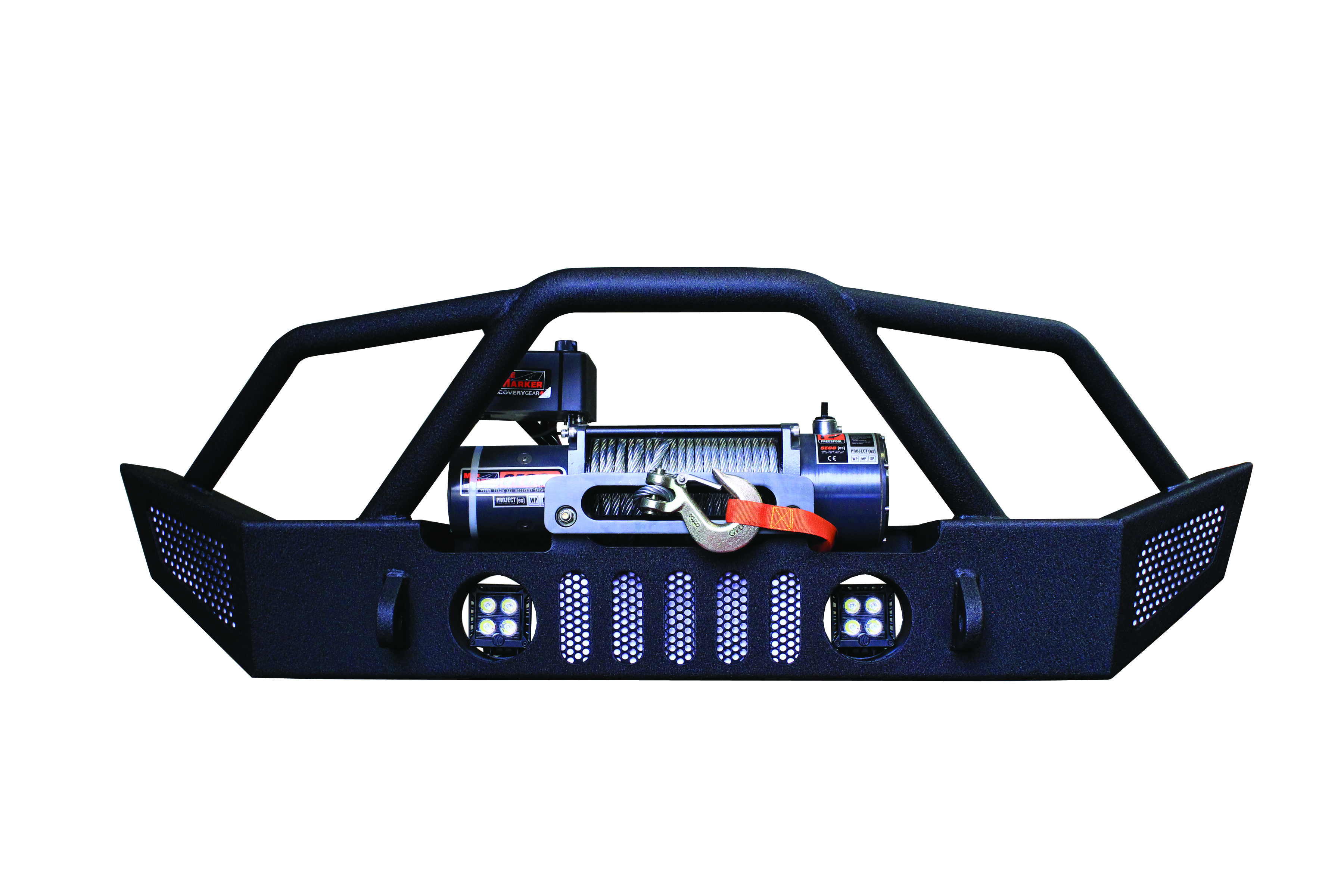 One Piece Design; Direct Fit; Mounting Hardware Included; Without Grille Guard; With Internal Winch Mount; With D-Ring Mounts; With Light Cutouts; Textured Black Steel; With License Plate Mount; Use Up To 9500 Pound Winch