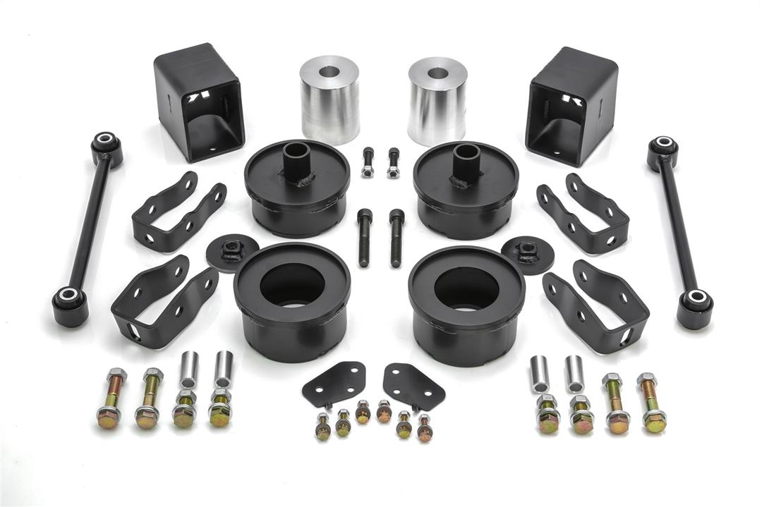 2-1/2 Inch Front Lift; 2 Inch Rear Lift; Without Shock Absorbers In Kit - Shock Change Not Necessary; Black Components; With Front And Rear Coil Spring Spacers/ Front Sway Bar End Links/ Front And Rear Shock Extensions/ Bump Stop Extensions/ Installation Hardware