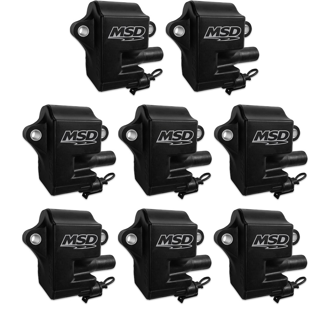 Single Tower Coil Pack; 44000 Volts; 0.57 Ohms Primary Resistance/ 3.1K Ohms Secondary Resistance/ 52:1 Turns Ratio/ 5.8mH Inductance/ 150mA Peak Current/ 1200 uS Spark Duration; Black; Set of 8