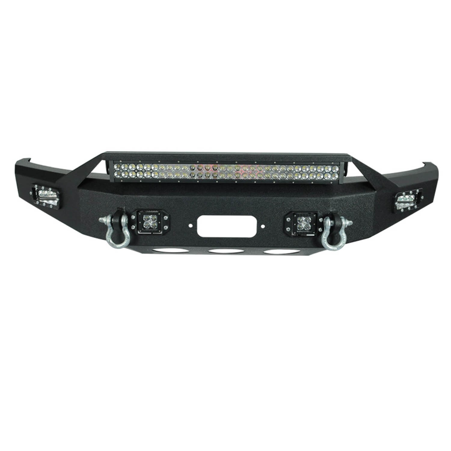 One Piece Design; Direct-Fit; Mounting Hardware Included; Without Pre Runner Hoop; With External Winch Mount; Without Tow Hook Mounts/ With D-Rings; With Two 12 Watt/ Two 15 Watt LED Lights/ With Mounting Option for 30 Inch Light Bar; Powder Coated Black