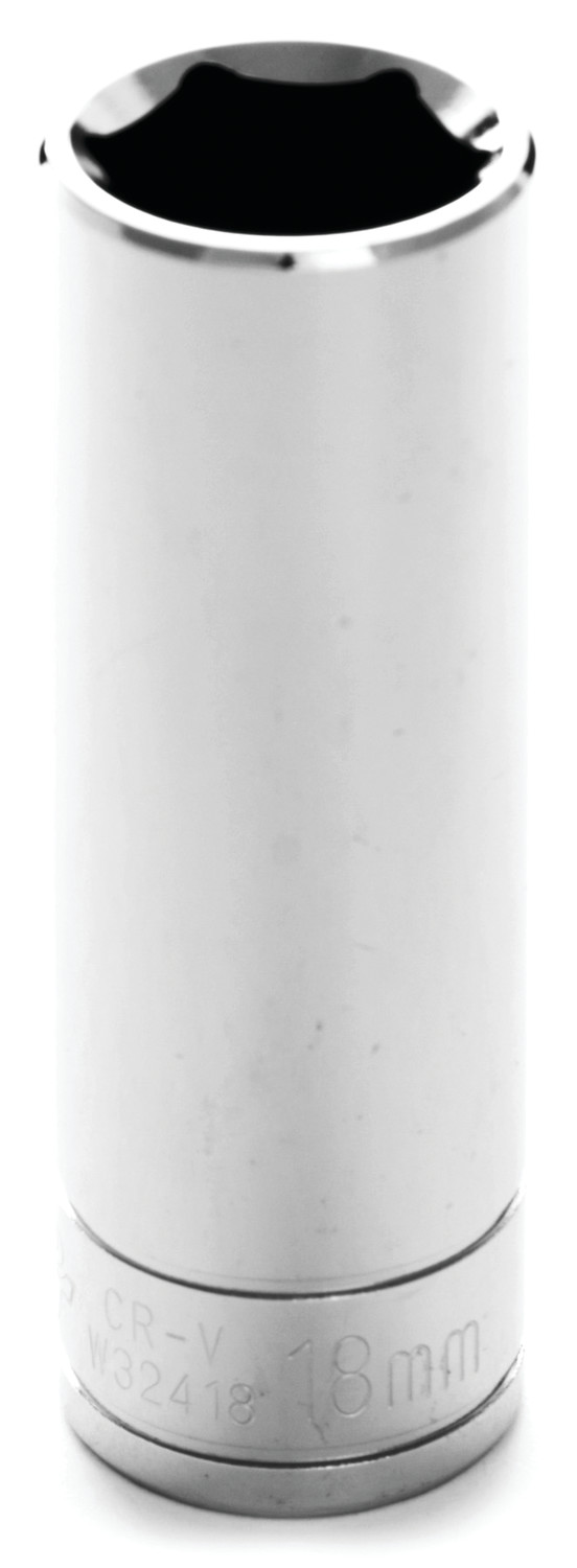 1/2 Inch Drive; 18 Millimeter; Metric; Deep Socket; 6 Point; Polished Nickel Chrome Plated; Vanadium Alloy Steel; Single