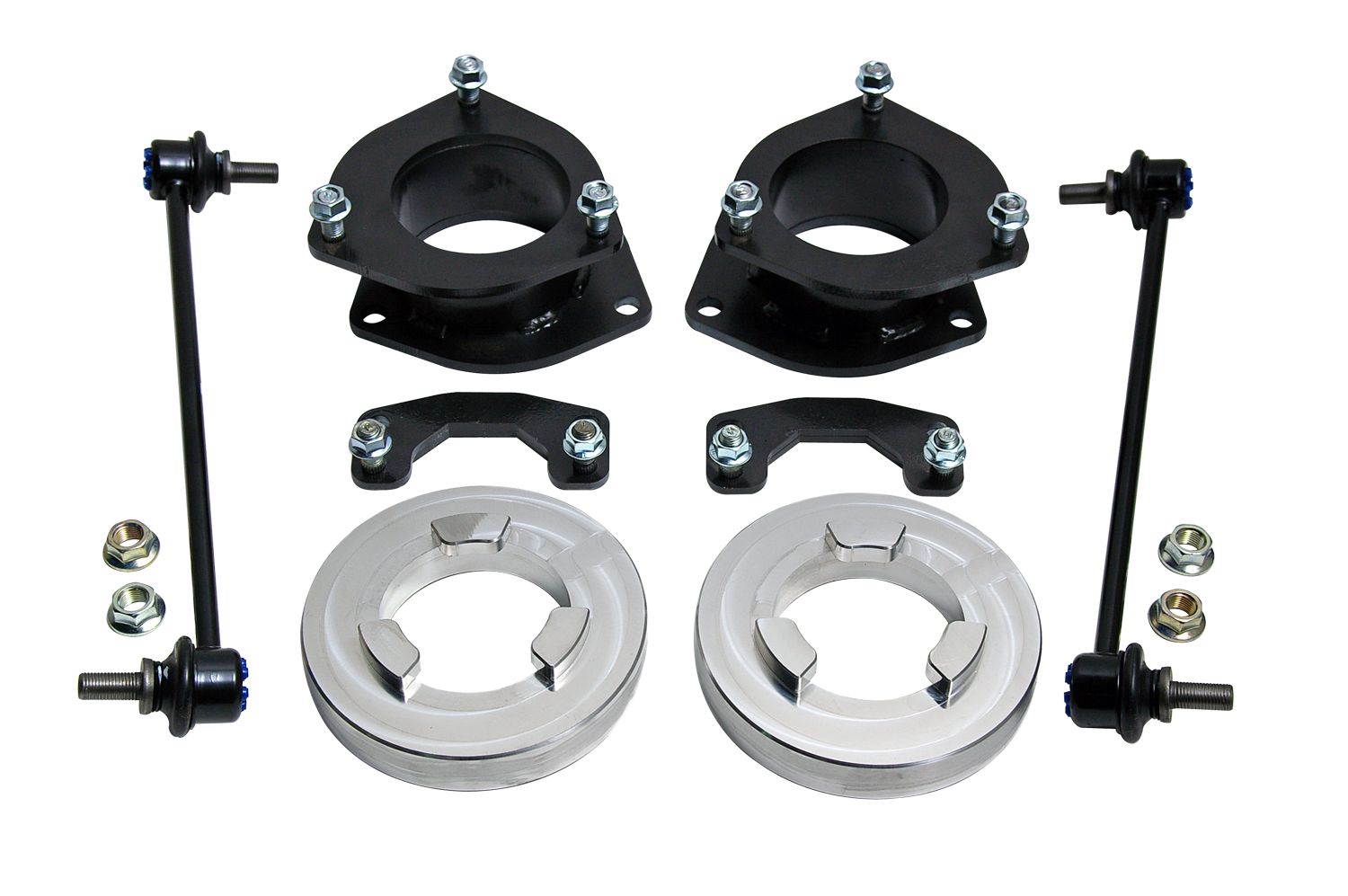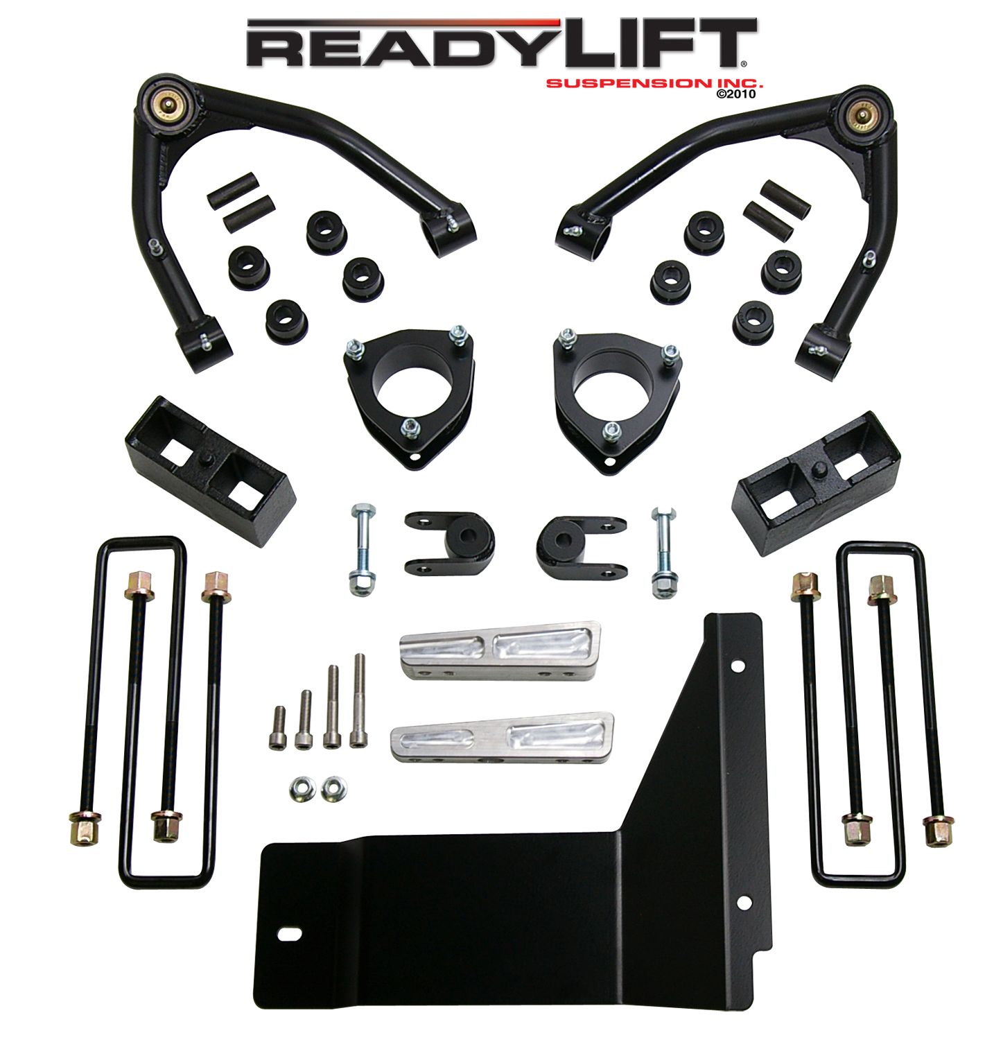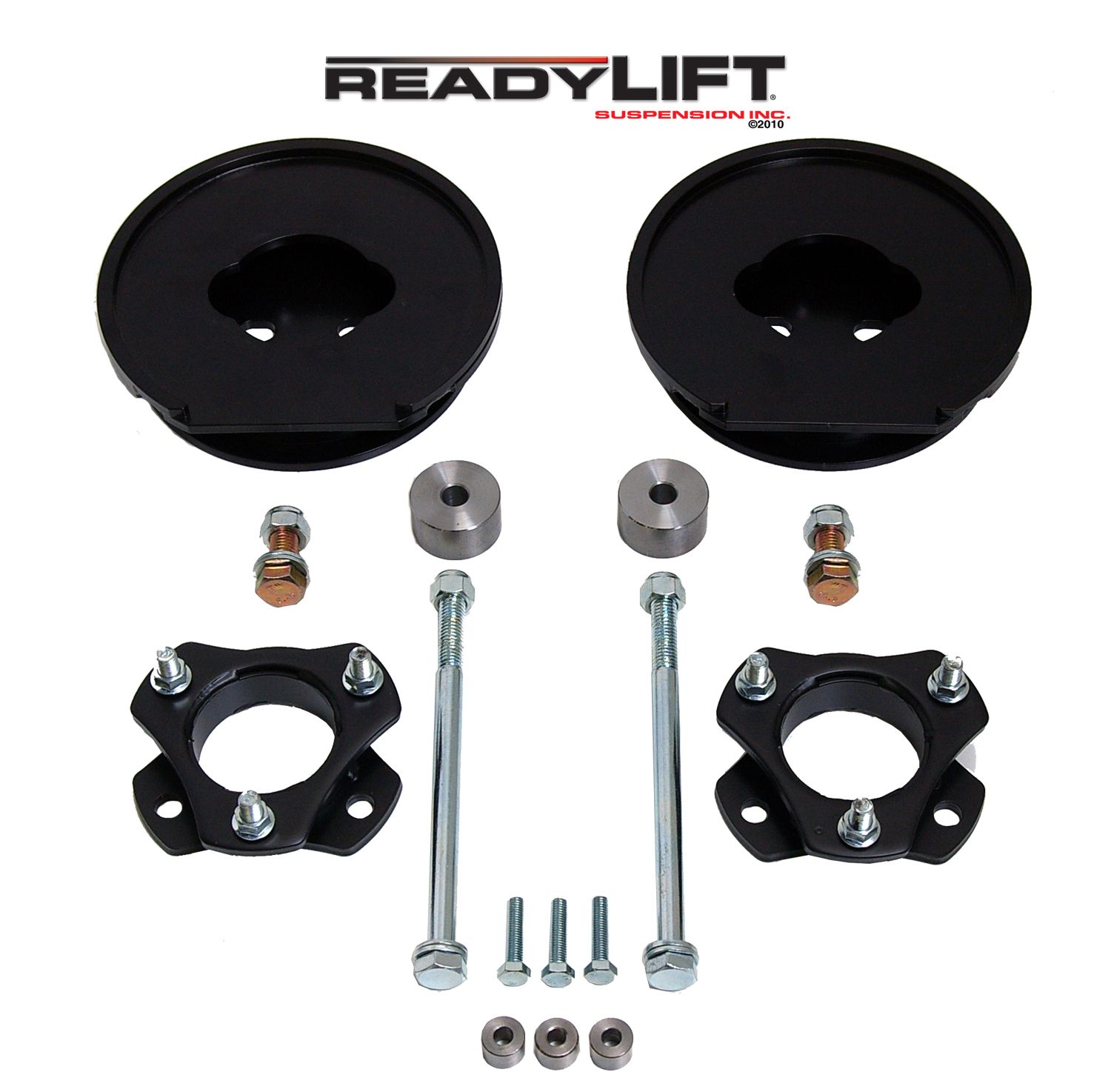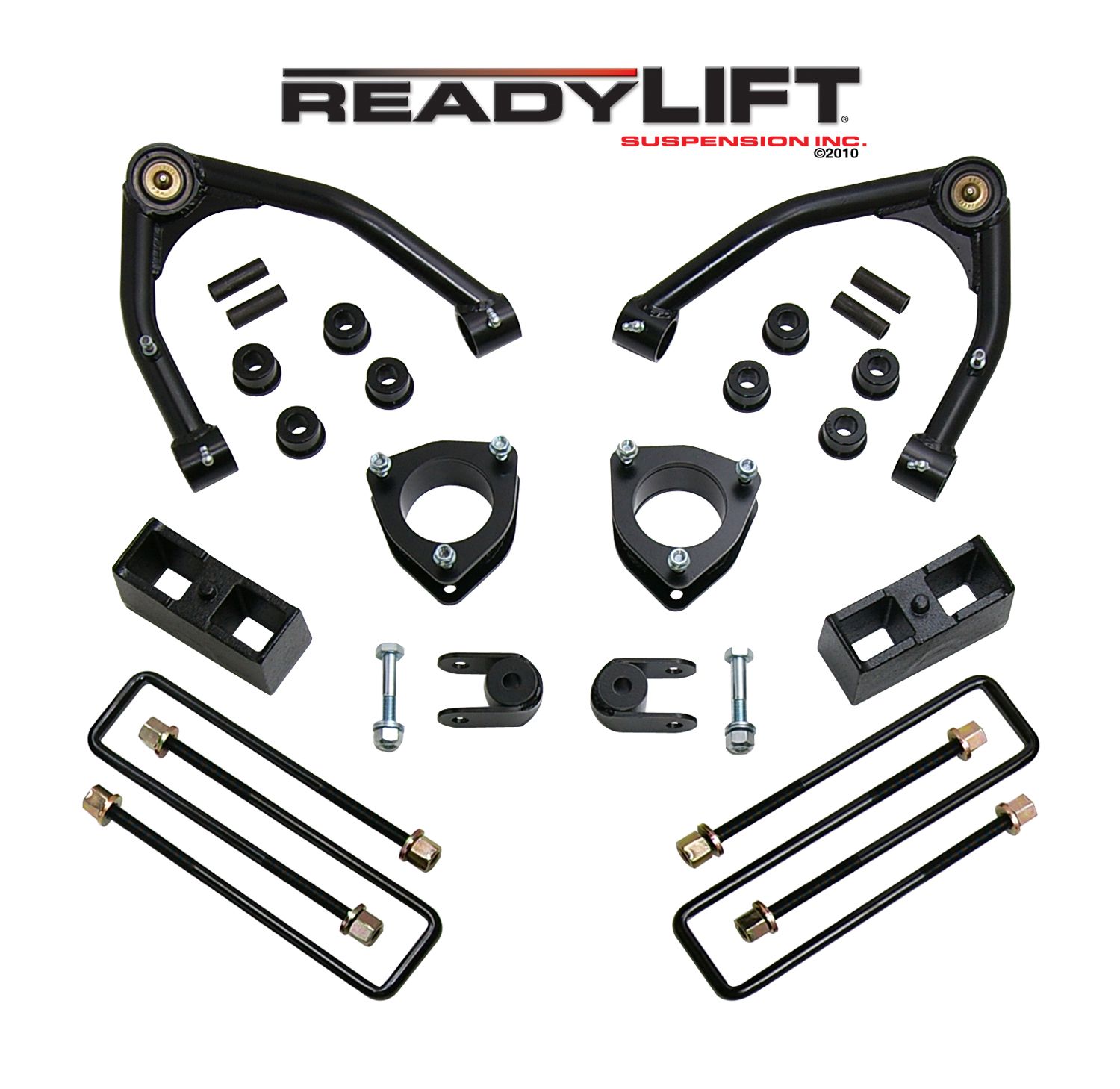 3 Inch Front Lift; 3 Inch Rear Lift; Without Shock Absorbers In Kit - Shock Change Not Necessary; Black Components; Includes Front Strut Extensions/ Rear Coil Spring Spacers/ Differential Drop Spacers/ Stabilizer Drop Spacers/ Skid Plate Sp