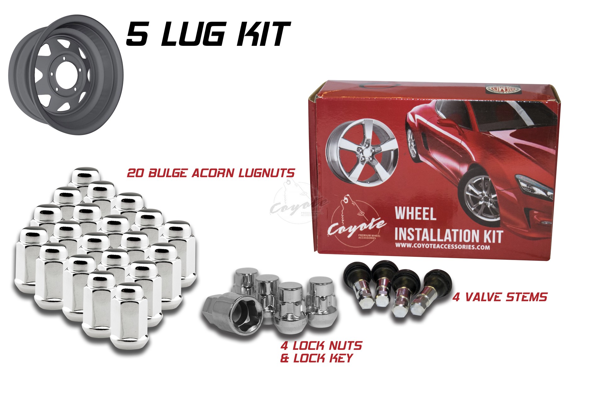 COYOTE 70K542 Wheel Installation Kit5 Lug Kit; 1/2 Inch x 20 Thread Size; 60 Degree Conical Bulge; Acorn; 1.90 InchMFG: COYOTE WHEEL ACCESSORIESMFG Part Number: 70K542REV70K542 $48.59 Details...