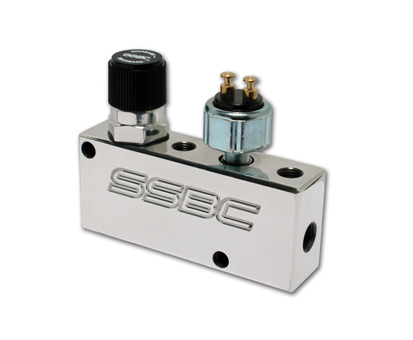 Adjustable; Polished; 2 Master Cylinder Inlets/ 2 Front Brake 3/16 Inch Outlets/ 1 Rear Brake 3/16 Inch Outlet; With 5 Stainless Steel 3/16 Inch Fittings/ Wiring Pigtail For Rear Brake Light Switch