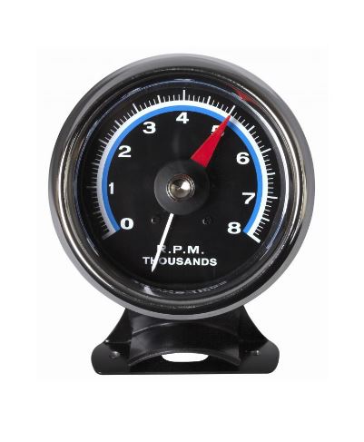 3-3/8 Inch; 250 Degree Sweep; Analog Display; 0 To 8000 RPM; Black Face/ Chrome Bezel/ Red Needle; With Two Mounting Brackets/ Steering Column/ Dash Mount