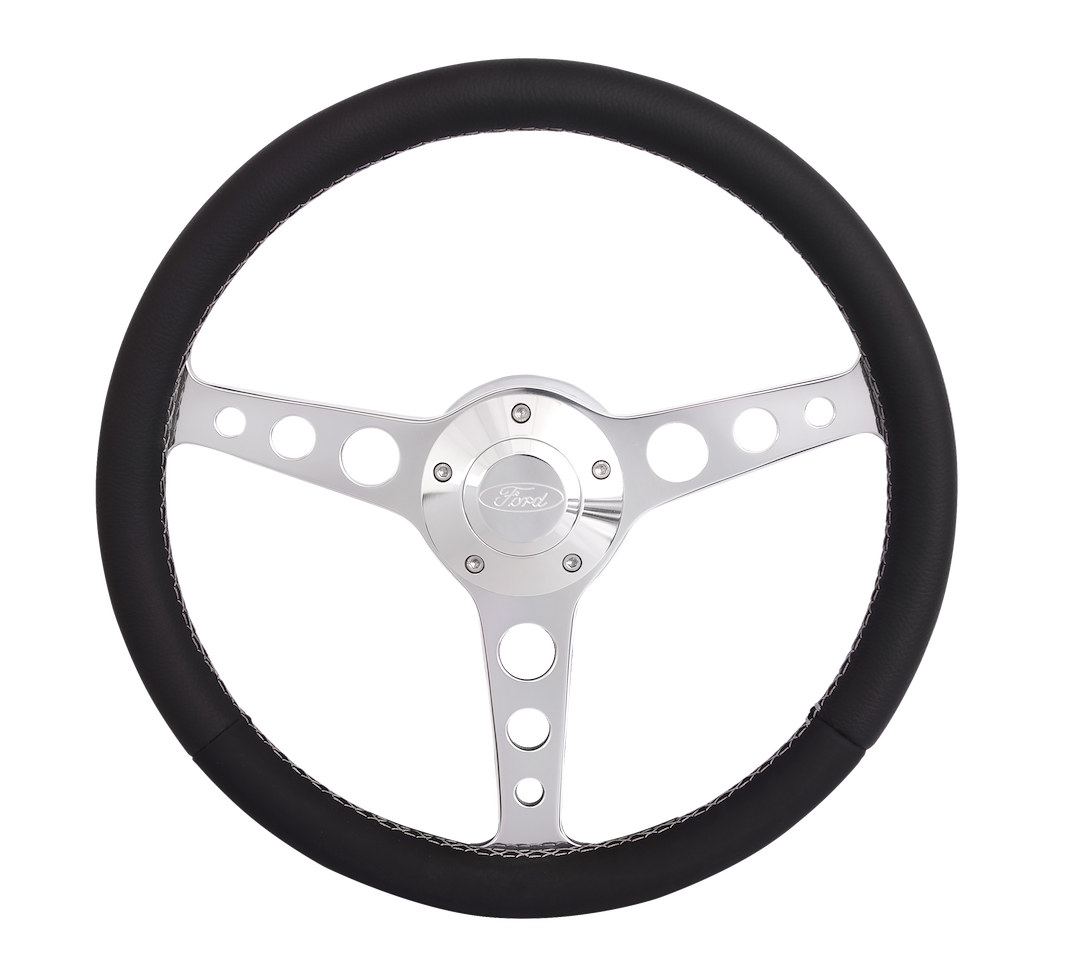 14 Inch Diameter; 3 Spoke; Black Leather Grip; Polished Spoke; With Ford Logo And Installation Kit