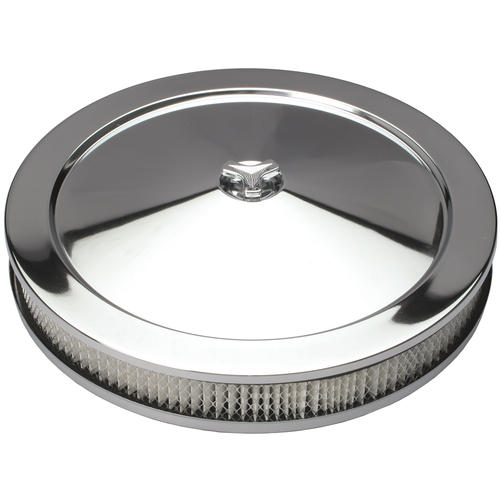Carbureted; 5-1/8 Inch Diameter Neck; 14 Inch Diameter X 2-1/8 Inch Height; Round; Chrome; With Filter; With Hold Down