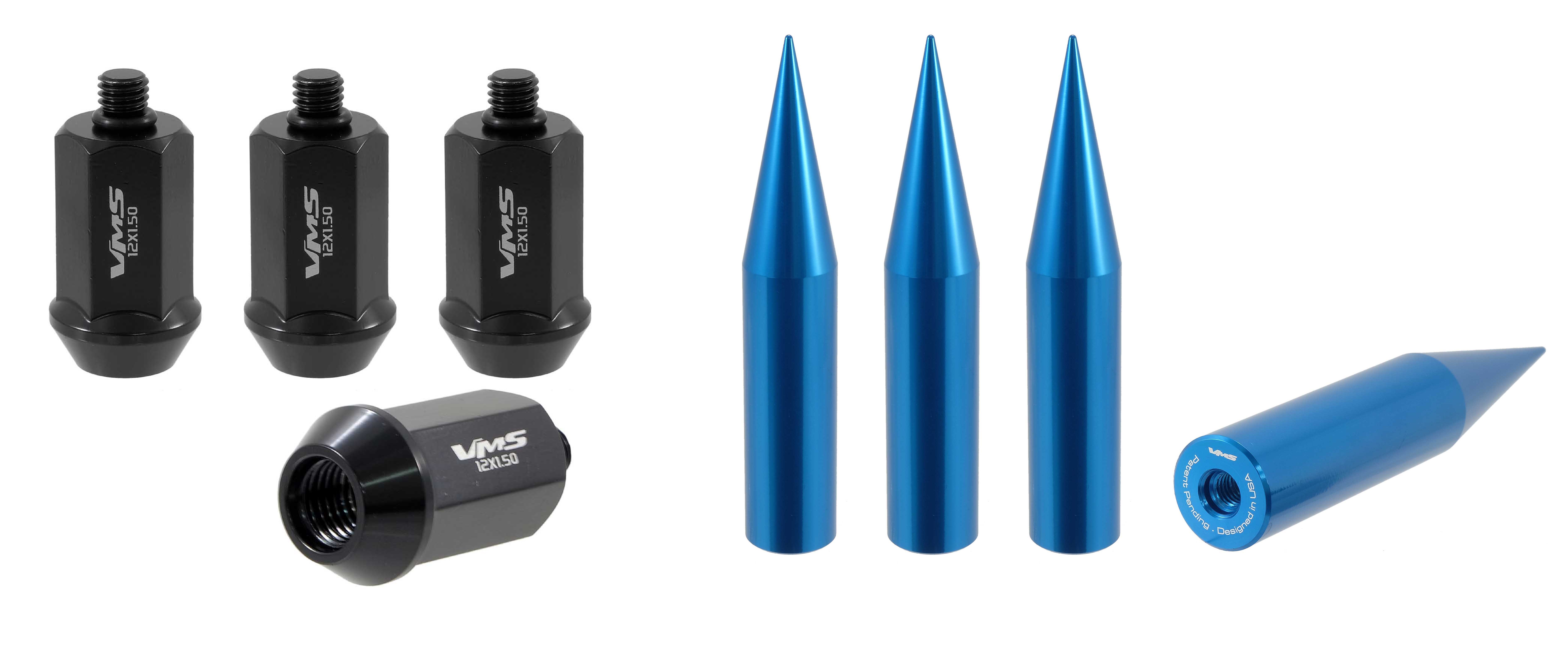 12 Millimeter x 1.5 Thread Size; 60 Degree Conical; Acorn; 1.53 Inch Overall Length; Black; Steel; Set Of 4; With 136 Millimeter Length Blue Spike Style Lug Nut Cover
