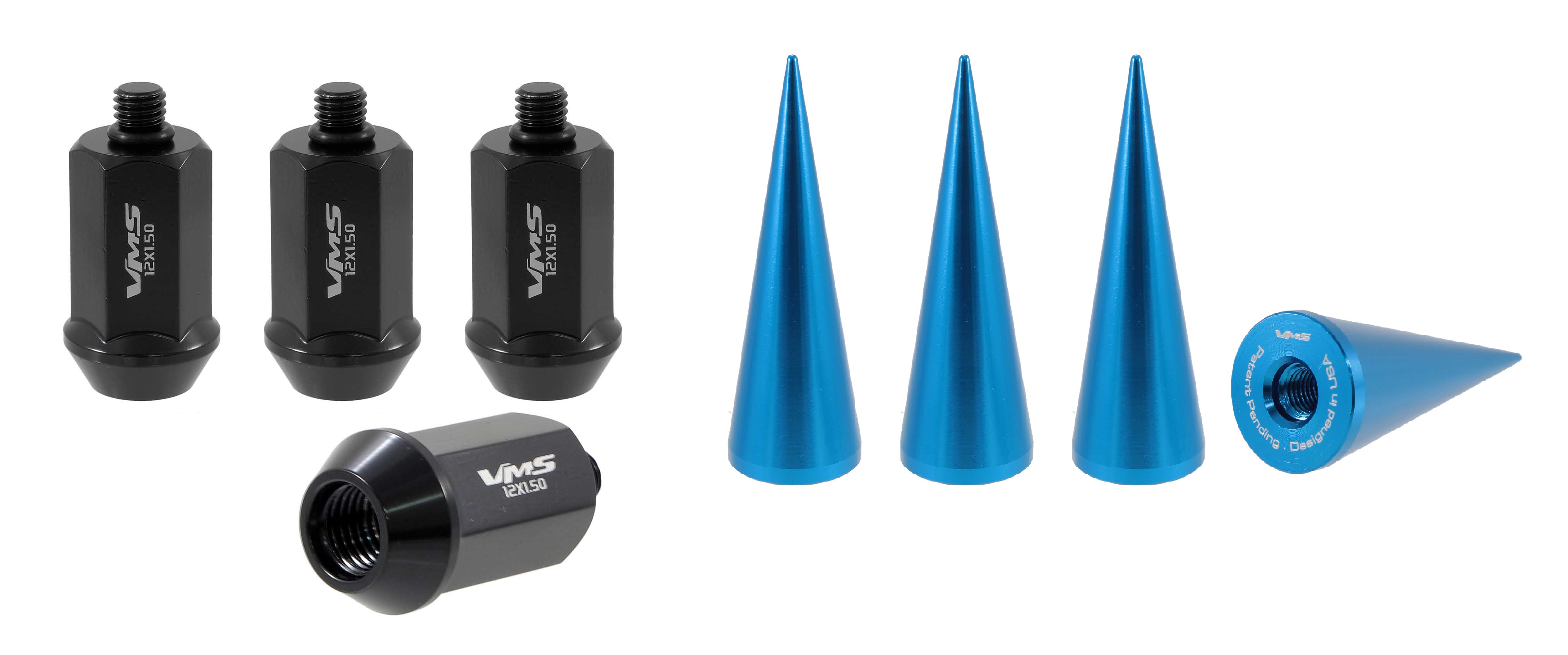 12 Millimeter x 1.5 Thread Size; 60 Degree Conical; Acorn; 1.53 Inch Overall Length; Black; Steel; Set Of 4; With 25 Millimeter Width 73 Millimeter Height Blue Spike Style Lug Nut Cover