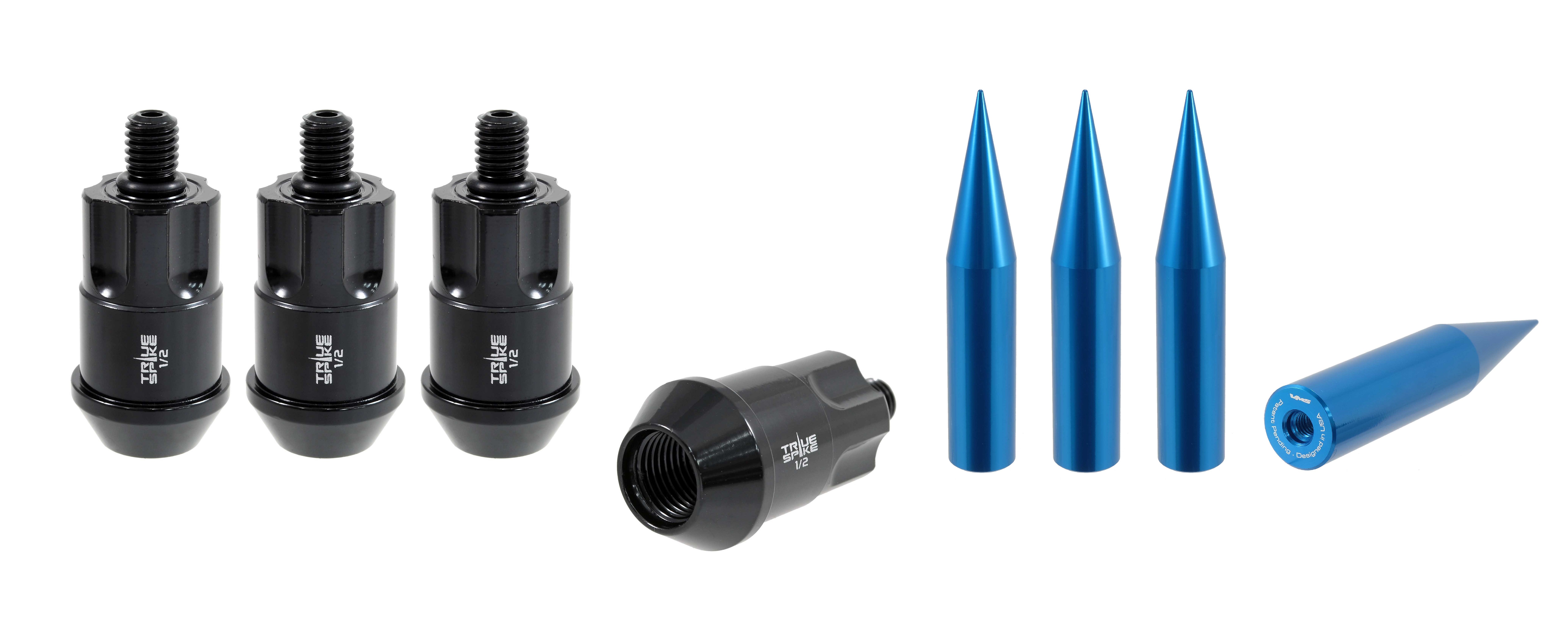 Lug Nut Lock; 1/2 Inch x 20 Thread Size; 60 Degree Conical; Acorn; 1.6 Inch Overall Length; Black; Steel; Set Of 4; With 136 Millimeter Length Blue Spike Style Lug Nut Cover