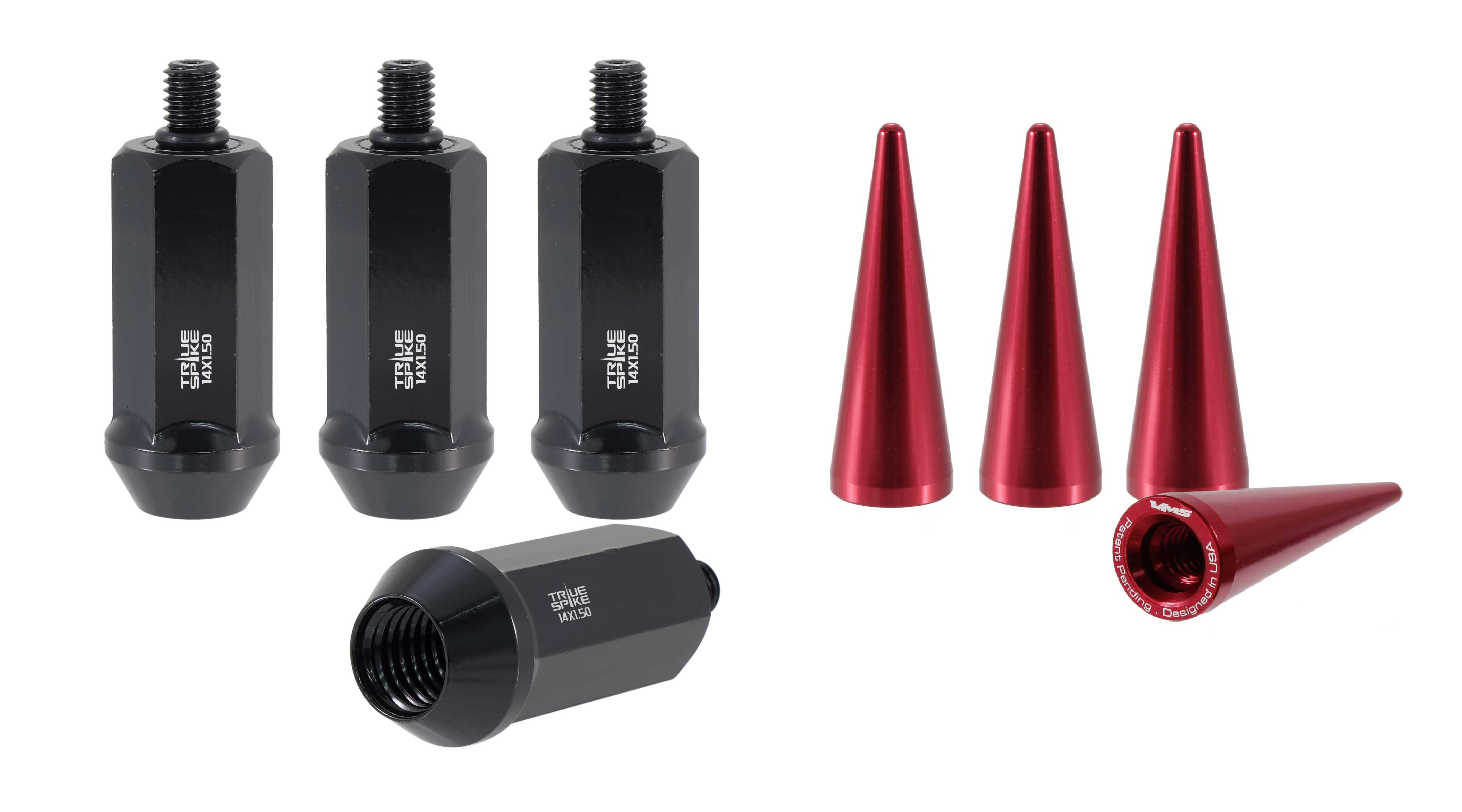14 Millimeter x 1.5 Thread Size; 60 Degree Conical; Acorn Duplex; 2.008 Inch/ 51 Millimeter Overall Length; Black; Steel; Set Of 4; With 51 Millimeter Length Red Spike Style Lug Nut Cover