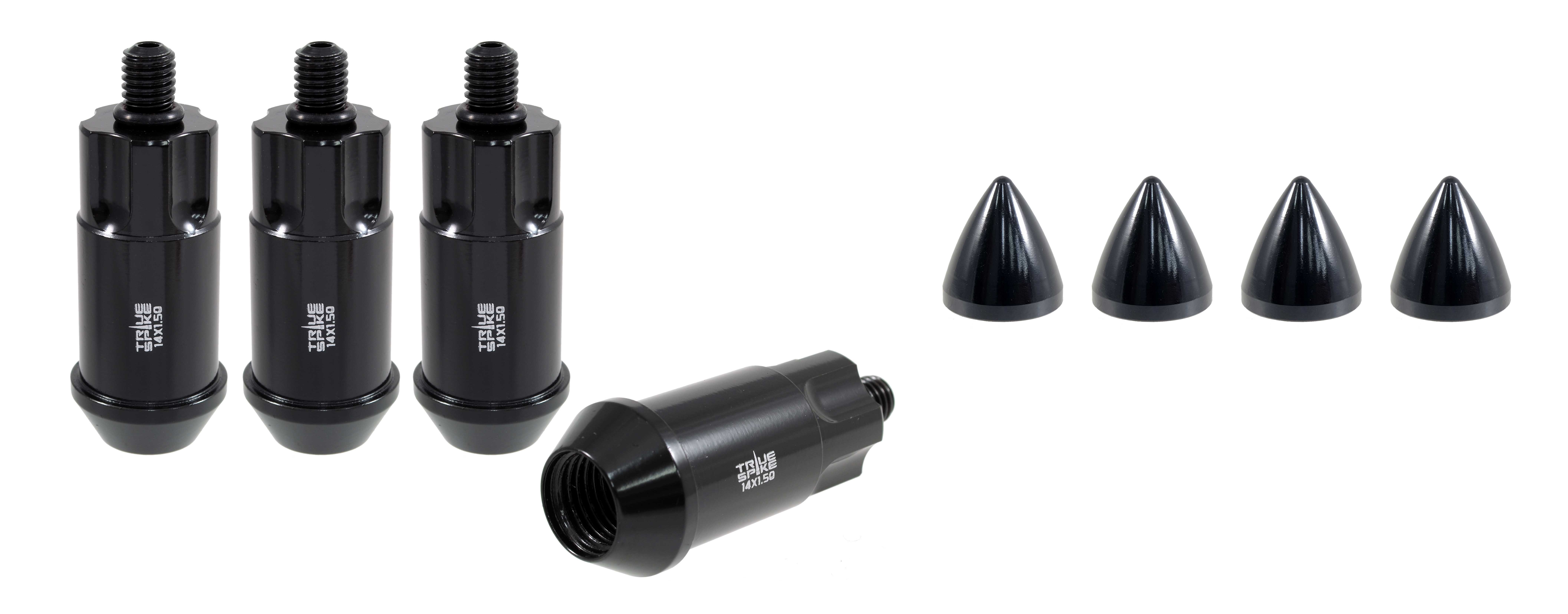 Lug Nut Lock; 14 Millimeter x 1.5 Thread Size; 60 Degree Conical; Acorn Duplex; 2.008 Inch/ 51 Millimeter Overall Length; Black; Steel; Set Of 4; With Black Small Bullet Tip Lug Nut Cover