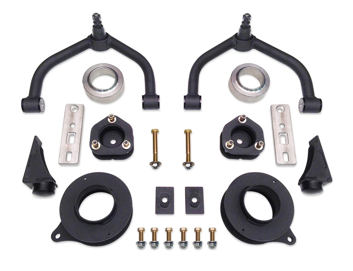 4 Inch Front Lift; 2-1/4 Inch Rear Lift; Without Shock Absorbers In Kit - Shock Change Necessary; Black Components; With Front Upper Control Arms And Standard Ball Joints/ Strut Assembly Spacers/ Rear Coil Spring Spacers Stabilizer Drop Brackets/ Bump Stop Brackets/ Installation Hardware