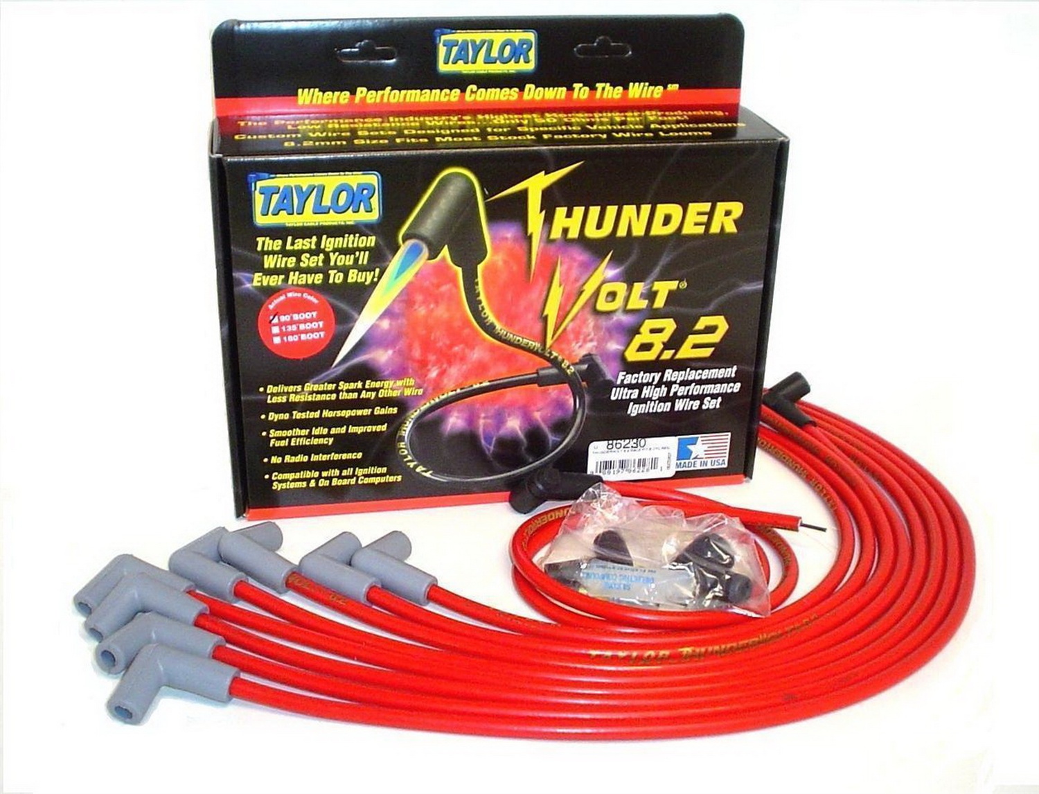 TAYLOR 86032 THUNDERVOLT 8.2 RFIT 8 CYLINDER BLACKThunderVolt 8.2 Race - Pre Assembled; Black; 8.2 Millimeter Diameter; Zimplex Silicone; Ferrite Spiral Wound Core; 135 Degree Spark Plug Boot; HEI Distributor Boot; 40 Ohms Per Foot Resistance; Without Wire Separators MFG: TAYLORMFG Part Number: 86032T6486032ships from manufacturer $198.83 Details...