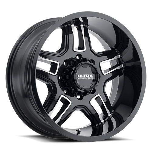 16 Inch Diameter x 6.5 Inch Width; 8 x 165.1 Millimeter/ 8 x 6.50 Inch Bolt Pattern; 60 Degree Conical Seat Lug; 0 Millimeter Offset; 3.75 Inch Backspacing; 105.00 Millimeter Center Bore; 5 Double Spoke; 1 Piece Cast Aluminum Construction; Gloss Black With Diamond Cut Accents; 4400 Pound Load Capacity; Compatible With TPMS (Tire Pressure Monitoring System); With Ultra Motorsports Logo Center Cap; Single