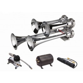 130 Decibels Train Horn; Round Trumpet; 15 Inch Length x 5-1/2 Inch Width x 6 Inch Height; Chrome Plated; Metal; With 12 Volt Compressor/ 2.5 Gallon Metal Air Storage Tank/ Stainless Steel Mounting Hardware/ 10 Foot Nylon High Pressure Hose/ 20 Foot Coiled Filler Hose With Brass Fittings